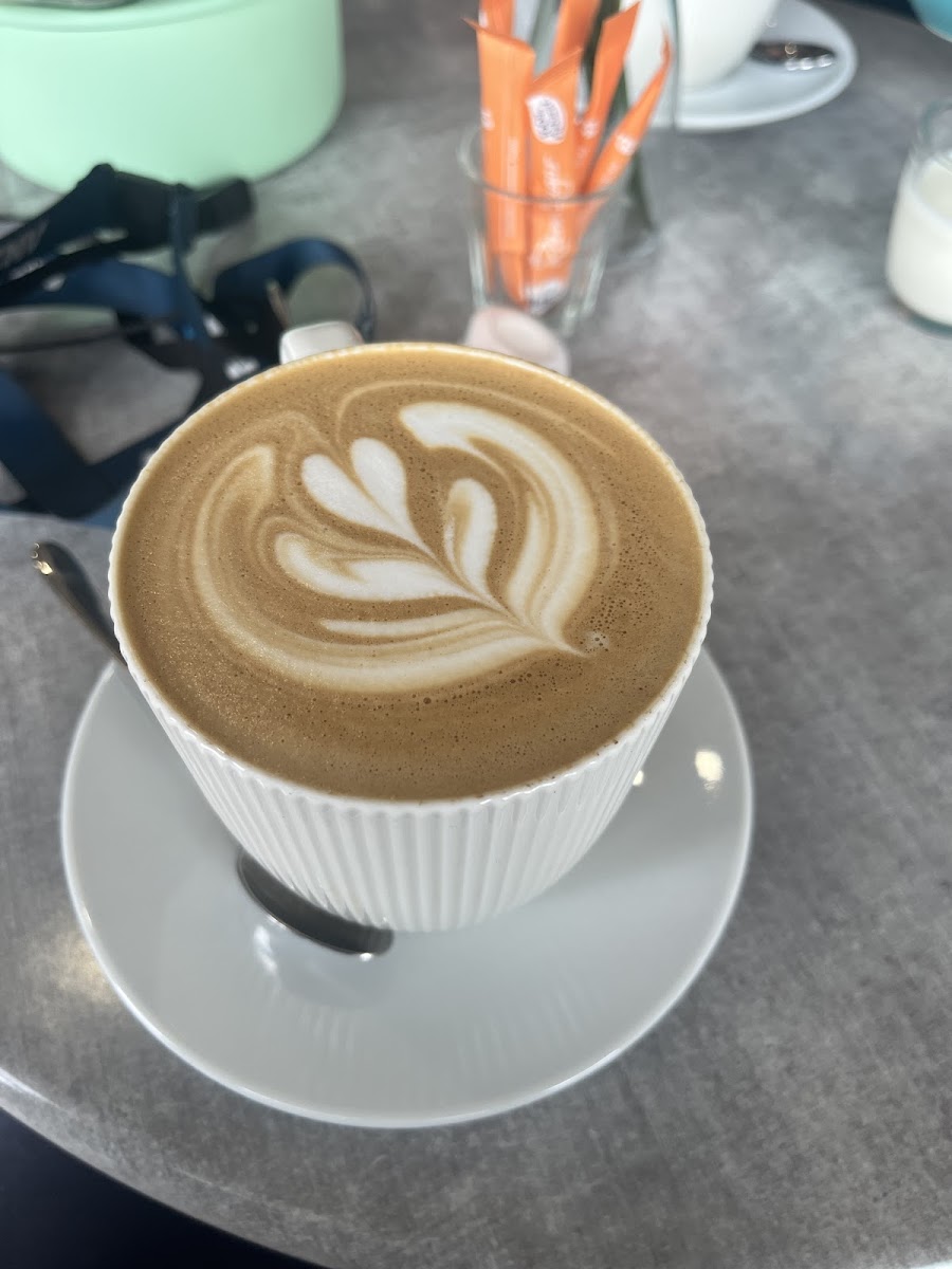Silky frothed milk poured over a shot of espresso, topped with a touch of chocolate